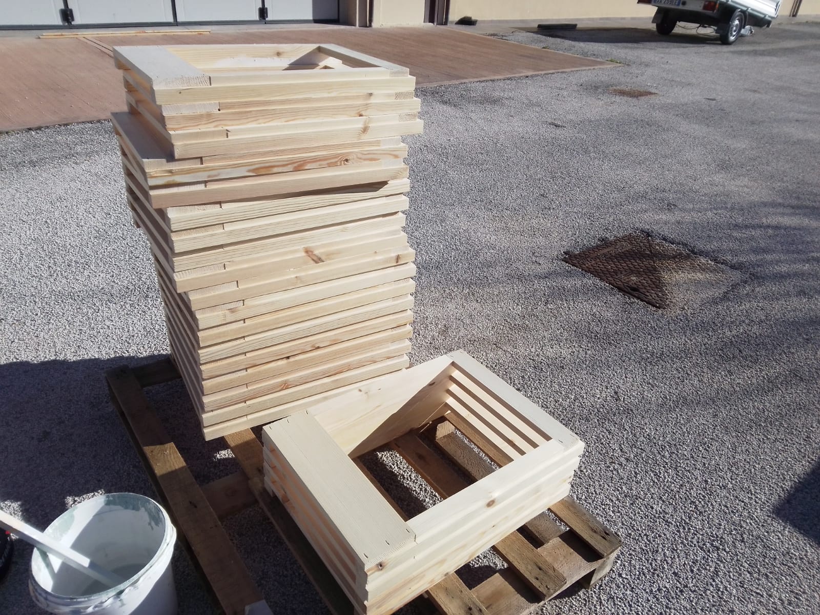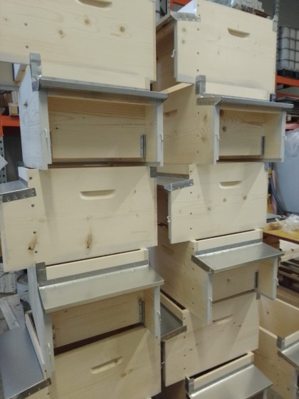 Anche l'attività di falegnameria è svolta nei nostri reparti in questa fase andiamo a valutare le arnie che possono essere ristrutturate e a crearne di nuove avvianod tutto il processo dalla fase di assemblaggio dei pezzi fino a quella di verniciatura .